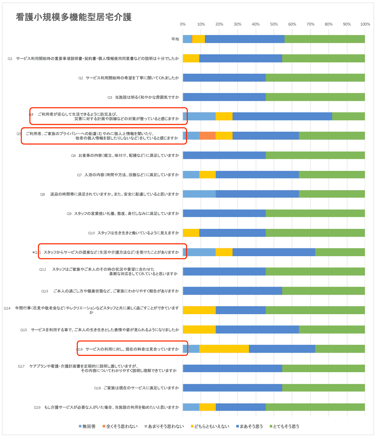 ご利用者様、ご家族様にとても高い評価を頂けたことに感謝いたします。その中で、質問項目によって「全くそう思わない(不満足)」「あまりそう思わない(やや不満足)」「どちらともいえない(満足はしていない)」という結果が多かったものがあったことも事実です。その項目に関して、